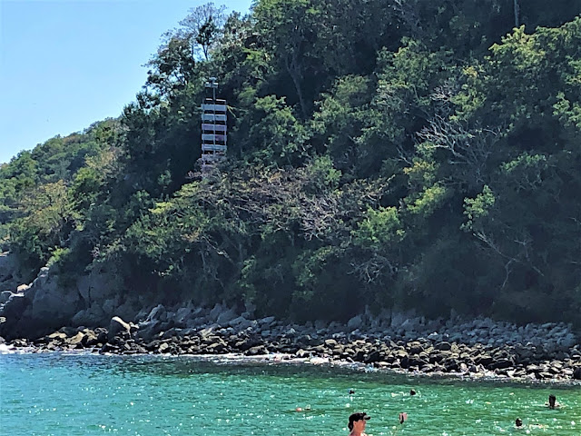 We decided to go back to Playa Santa Cruz this morning. Took a taxi as it was another warm day. This time we walked along until we saw where we wanted to sit first. That was near the right end, where the ground was flat and we wouldn't have to be sitting slanted which is really painful in those plastic chairs after days. My tailbone always aches when visiting places with bad chairs. It was called "Frente Al Mar". Our server Isaac set up some loungers for us in front of our table. He told us that was $100 pesos ($6.70 CAD) more. We asked him why the U.S. Coast Guard was here and he said "looking for drug smuggling bandidos". He said the Canada Coast Guard also comes for the same reason.